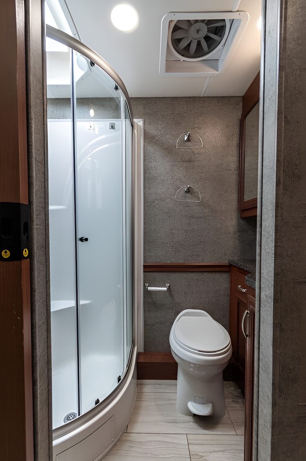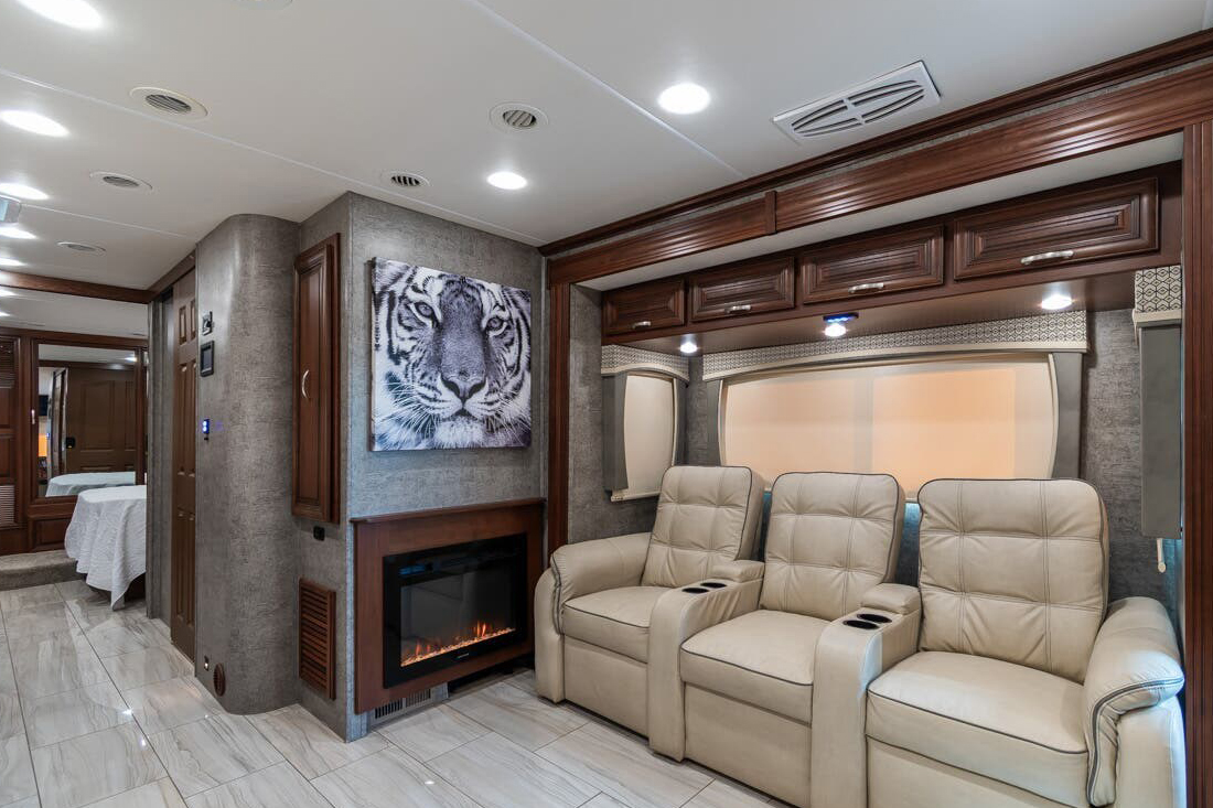 This coach keeps you comfy in any season. The AC cools you off fast in summer. The fireplace and heater keep you warm in winter. The thick walls help hold in the perfect temperature.