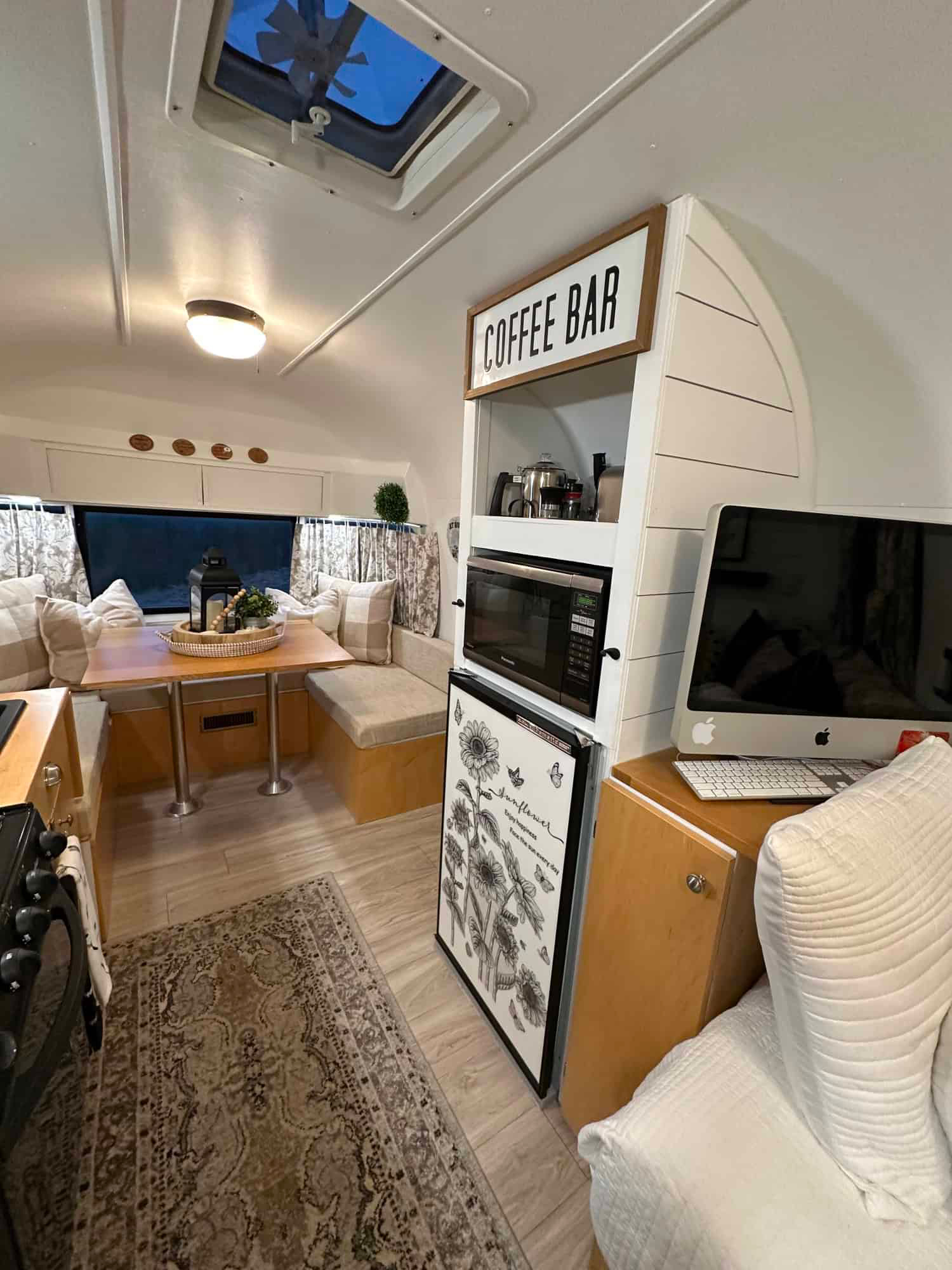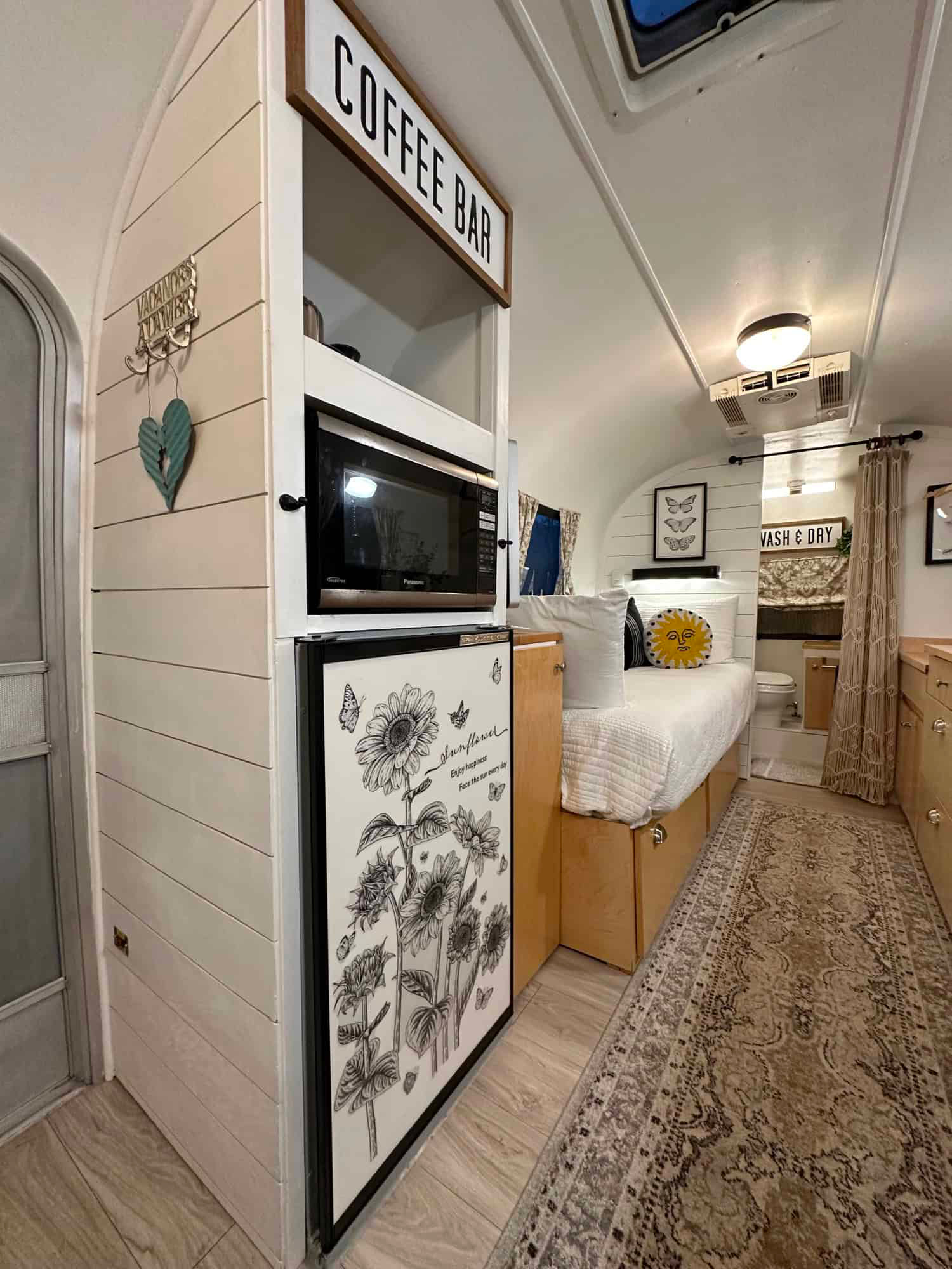 Appliances fit neatly in place, including a fridge with a floral design, a microwave, and a stove. Open shelves above the counter hold coffee supplies. There’s even a sign that says “Coffee Bar” to make you smile every morning.