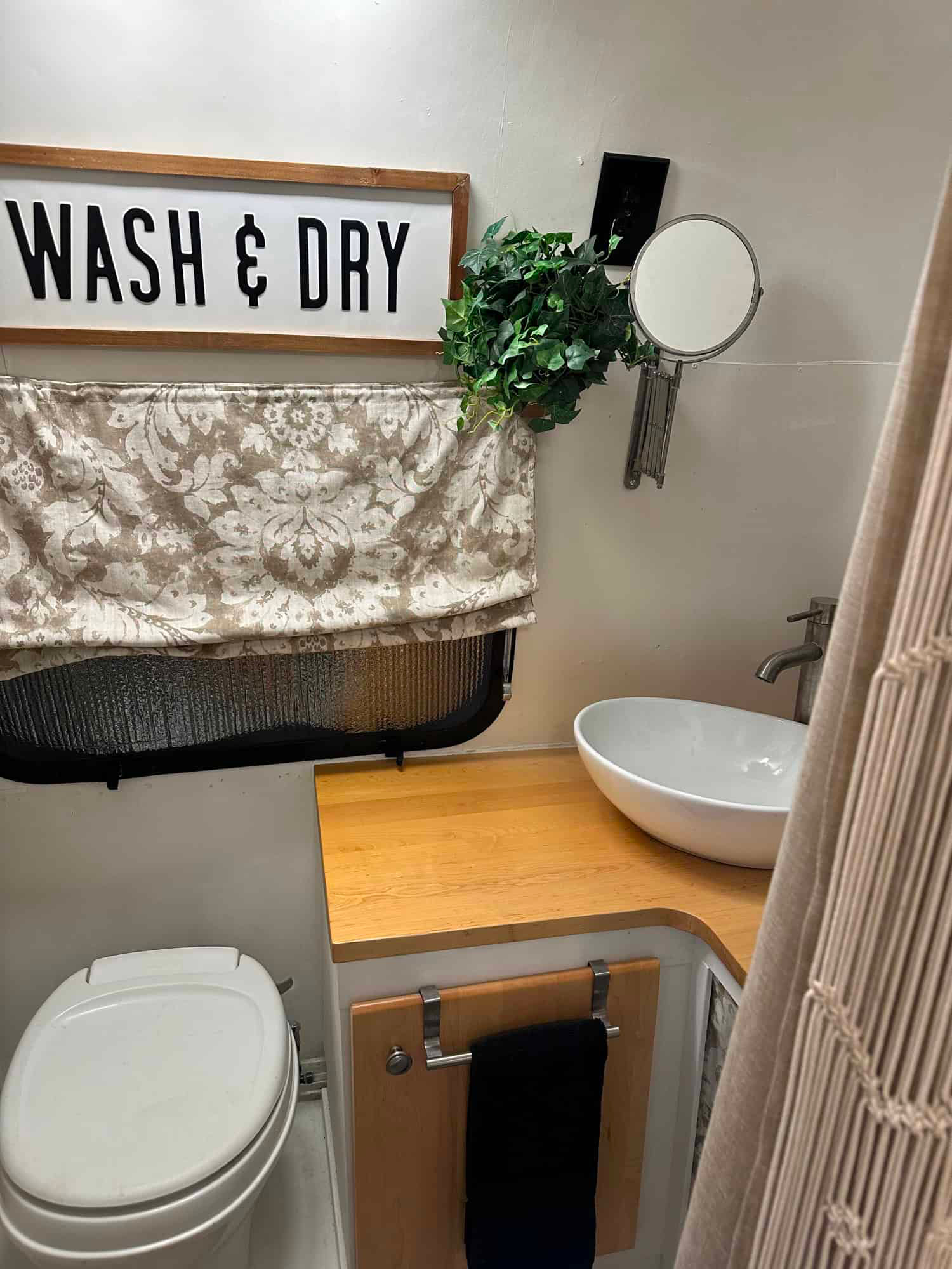 Behind a curtain made of thick, soft string, you’ll find the bathroom. It’s small but never feels cramped. The white sink sits on a wood counter, and the faucet has a smooth, modern curve. Above the toilet, a cheerful “Wash & Dry” sign adds a bit of fun. Another framed flower print ties in with the soft, floral theme.