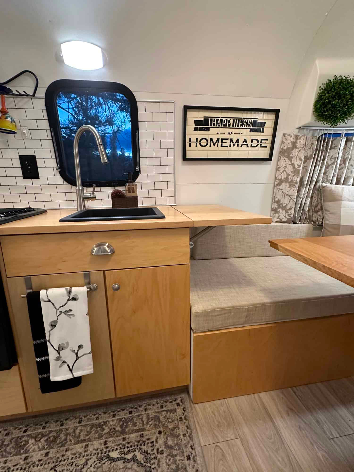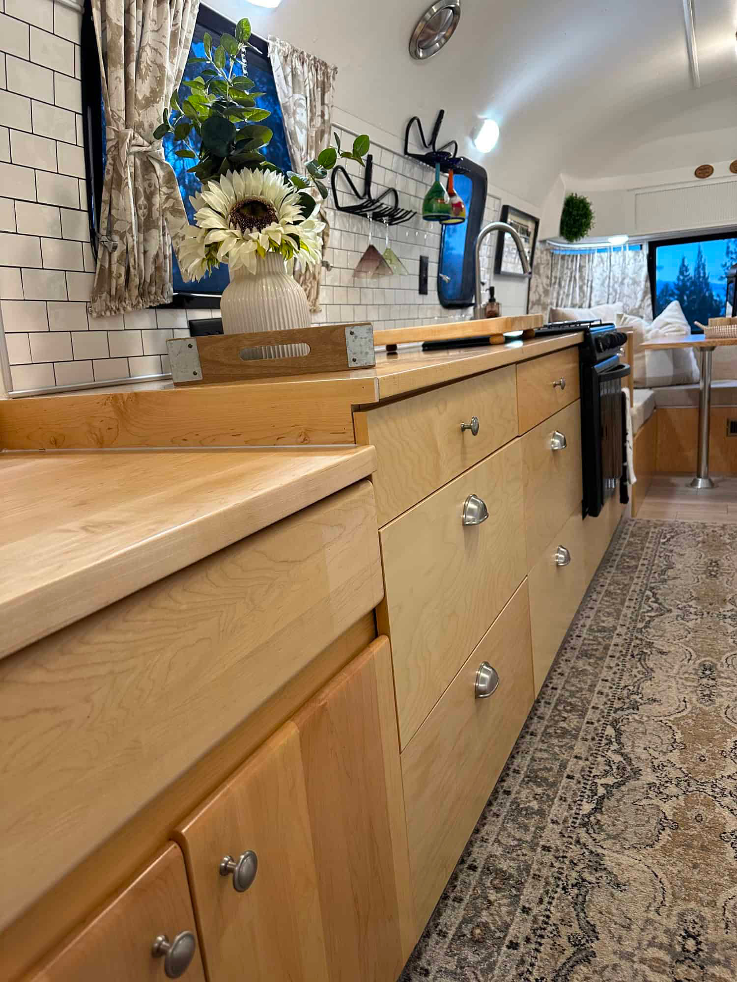 Now let’s talk about the kitchen. It may be compact, but it works hard. The wood counters shine and feel soft to the touch. A white tile backsplash keeps things bright and clean.