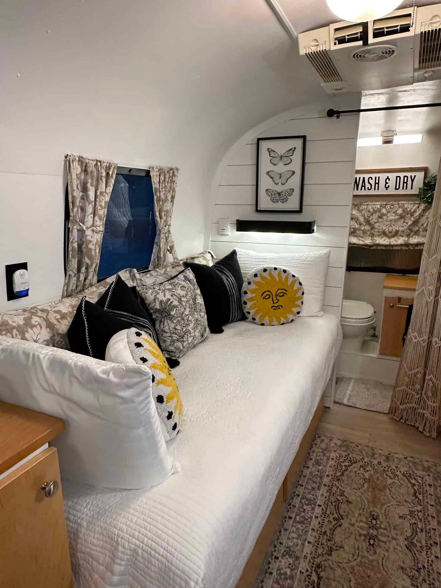 Open the Airstream’s door and you step into a bright, open space. The walls are white, the wood is light, and the air feels calm. There are cozy touches everywhere.