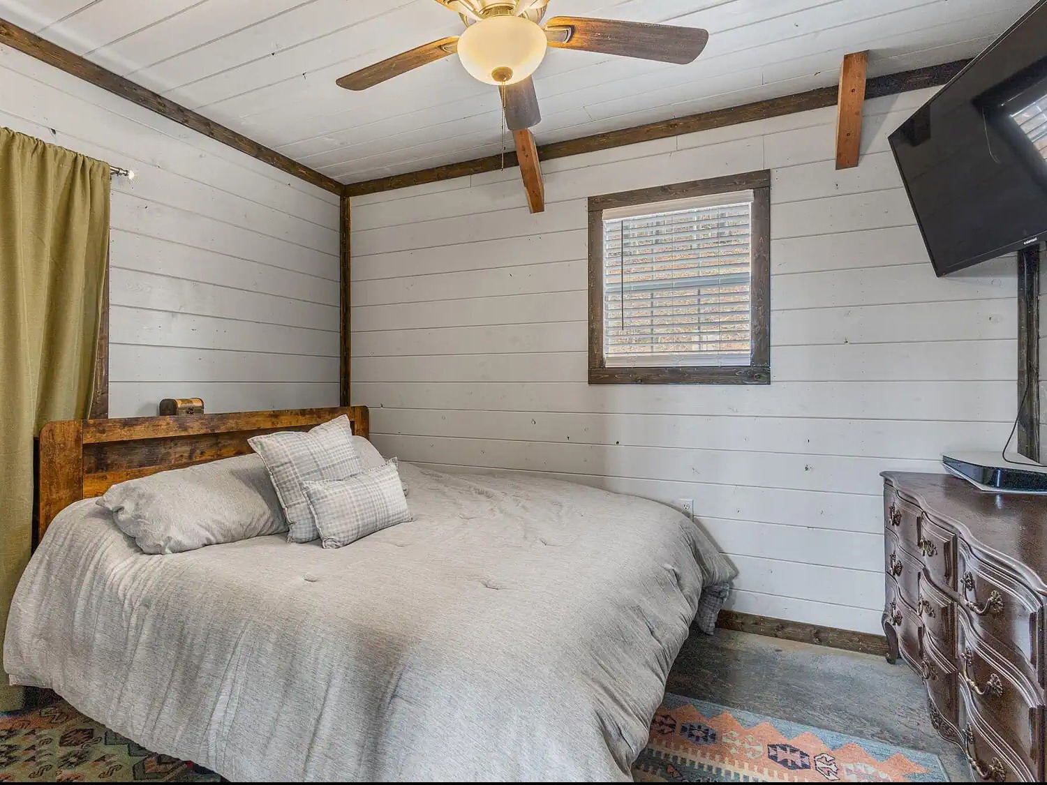 White plank walls continue the language of the rest of the house. Dark wood trim frames the room and adds contrast. The wood bed echoes the rustic tone without overwhelming the small space. Neutral bedding keeps the room restful, while the patterned rug adds just enough color and softness.