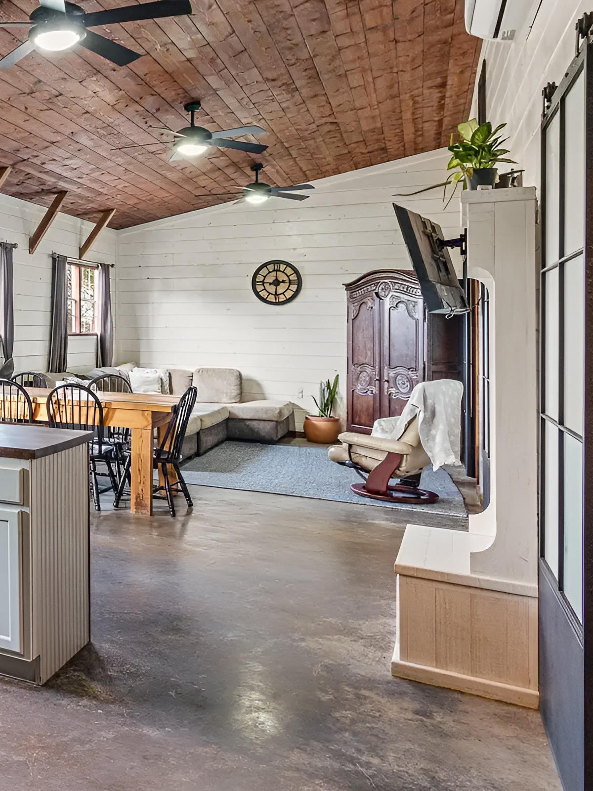 The polished concrete floors run through the main spaces and into the bathroom. That continuity helps the home feel larger and more unified. It also fits the barndominium style perfectly. Concrete feels durable, honest, and low-maintenance. Those qualities match the spirit of the home.