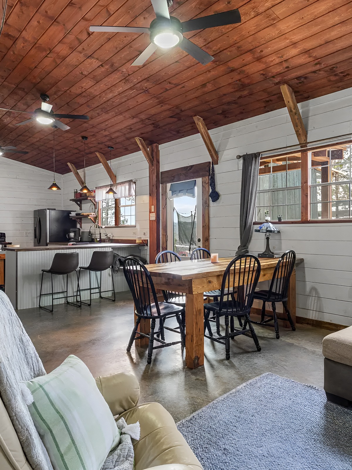 This area also benefits from the windows. Natural light keeps the rustic materials from feeling too dark. That is a recurring strength throughout the house. Whenever the home uses heavier elements like stained wood or dark metal, it balances them with white walls or daylight.