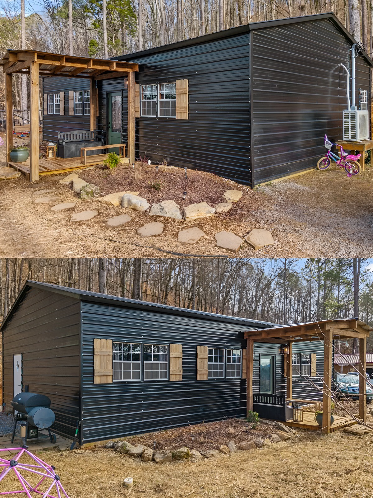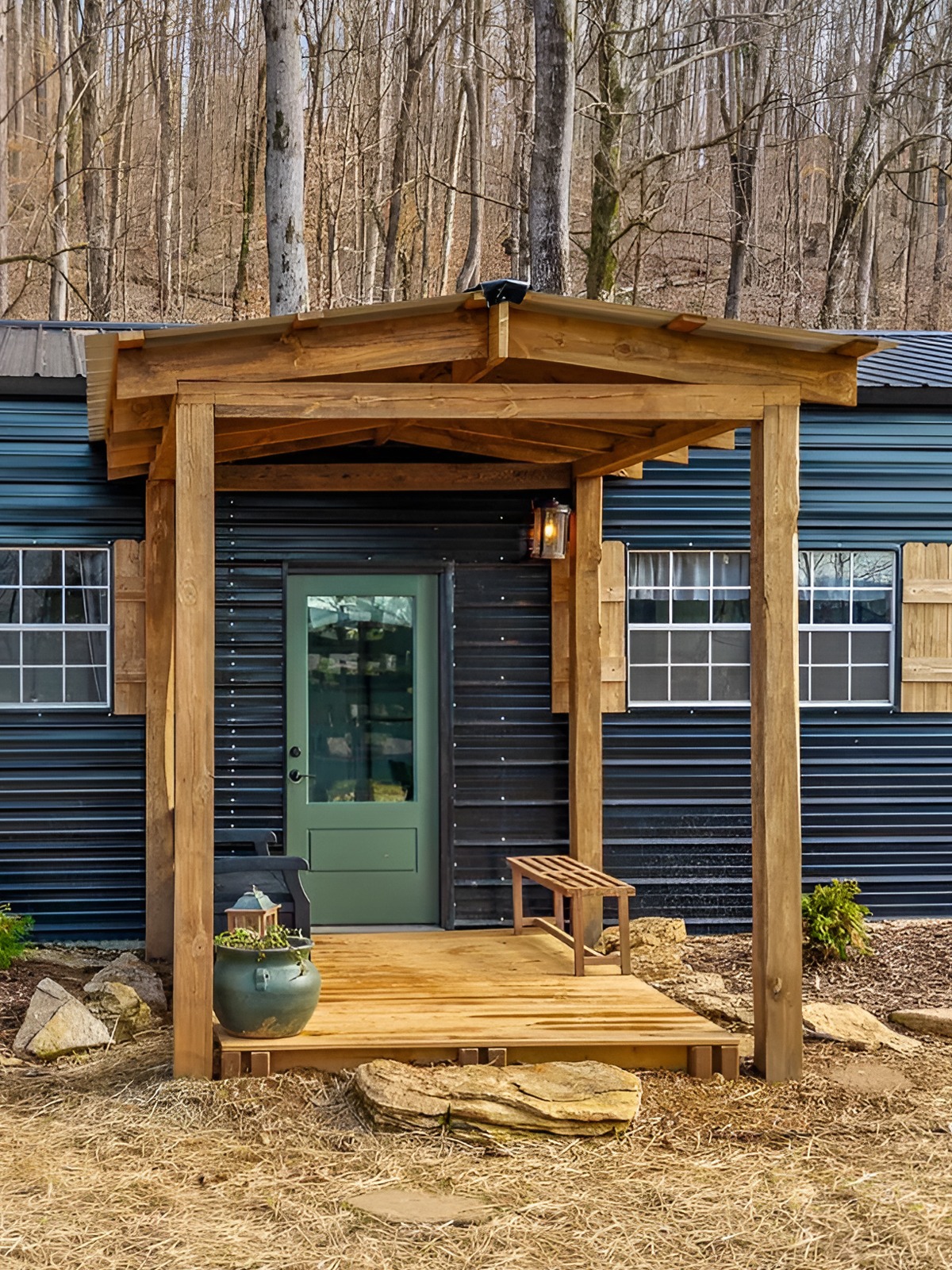 Choose one strong siding color and let it carry the design. Dark metal works especially well if you want a clean, modern-rustic feel. Keep the building shape simple. Then add warmth through a few natural accents instead of piling on decorative features.