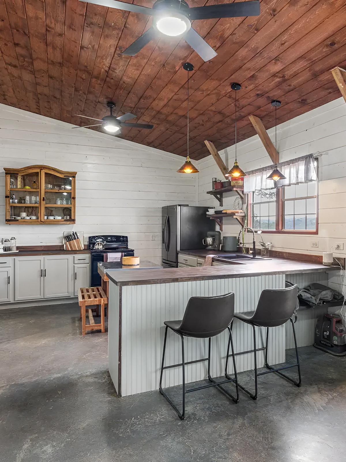 The island adds both prep space and casual seating. It does not look oversized, which is a smart choice in this house. Instead, it fits the room and keeps the flow easy. The beadboard detail on the island face adds subtle cottage charm, while the metal-topped prep table adds a practical, workshop-like note that fits the barndominium vibe perfectly.