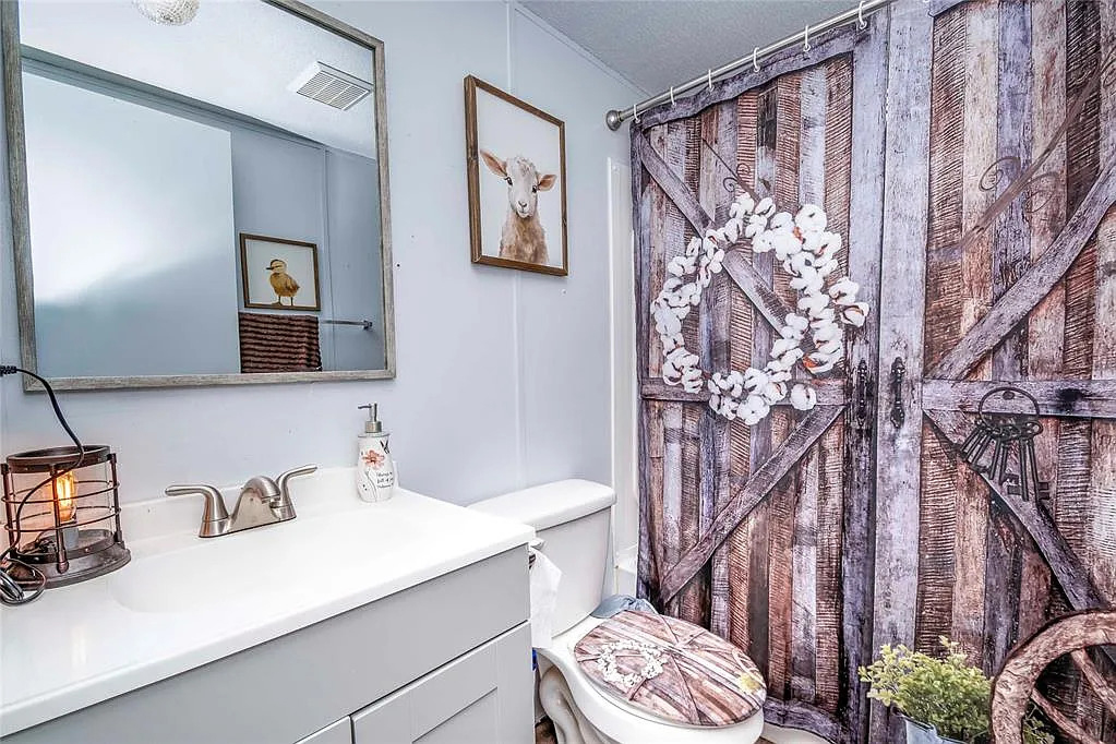 The bathroom is full of personality. The shower curtain looks like a barn door with a wreath. There’s even a toilet seat that matches! A potted plant adds some green. The vanity is white and simple, with a big mirror that makes the space feel bigger. Cute animal art makes you smile.