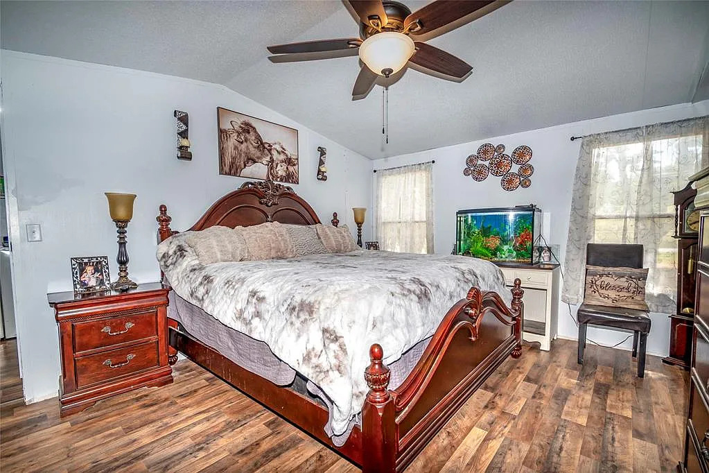 The main bedroom is a peaceful spot. The dark wood bed is big and comfy. Soft blankets make it inviting. There are two windows for lots of sunlight. Lace curtains filter the light and keep things soft.