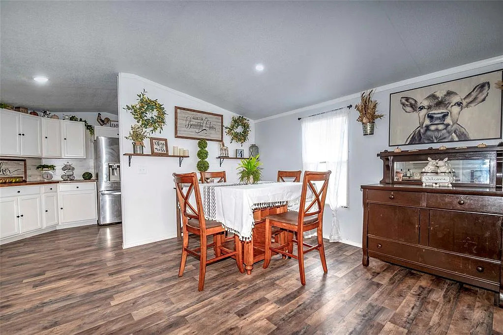 The dining table sits between the kitchen and living room. It’s a wooden table with matching chairs. A white tablecloth keeps things light and bright. Farmhouse signs and little green plants decorate the walls. A wooden buffet gives extra storage.