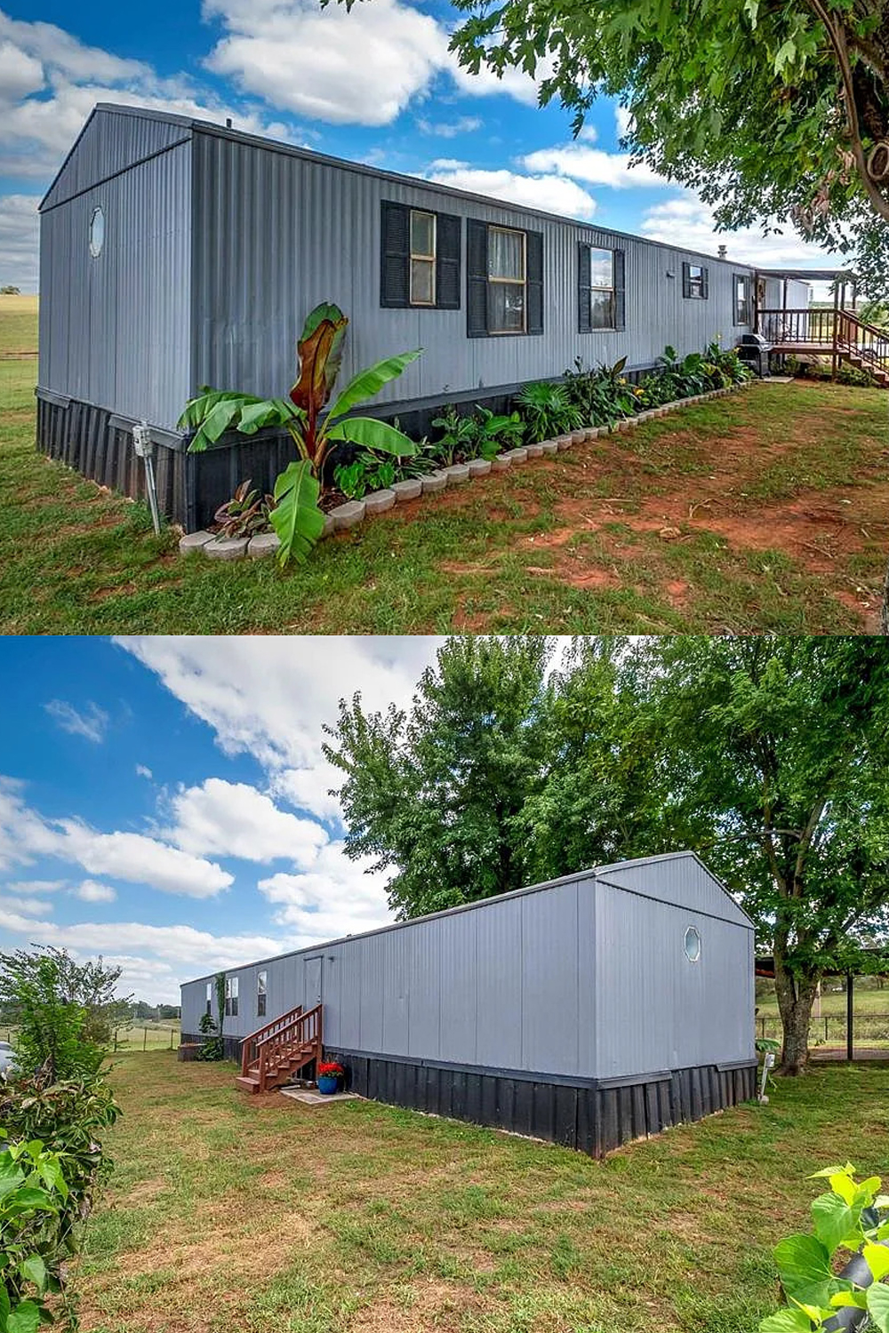 This mobile home sits on a big green lot. The outside is painted a soft blue-gray color. The black trim around the windows makes it pop. The base of the home is a darker color, which helps it blend in with the land. These color choices make the home look neat and fresh.