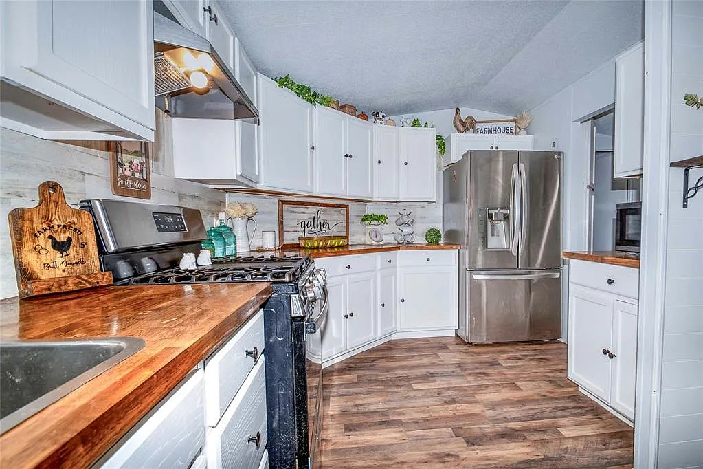 Cabinets line the walls. They are painted white, which makes the kitchen look bigger and cleaner. The handles are black, which adds a pop of contrast. Butcher block countertops look warm and natural.