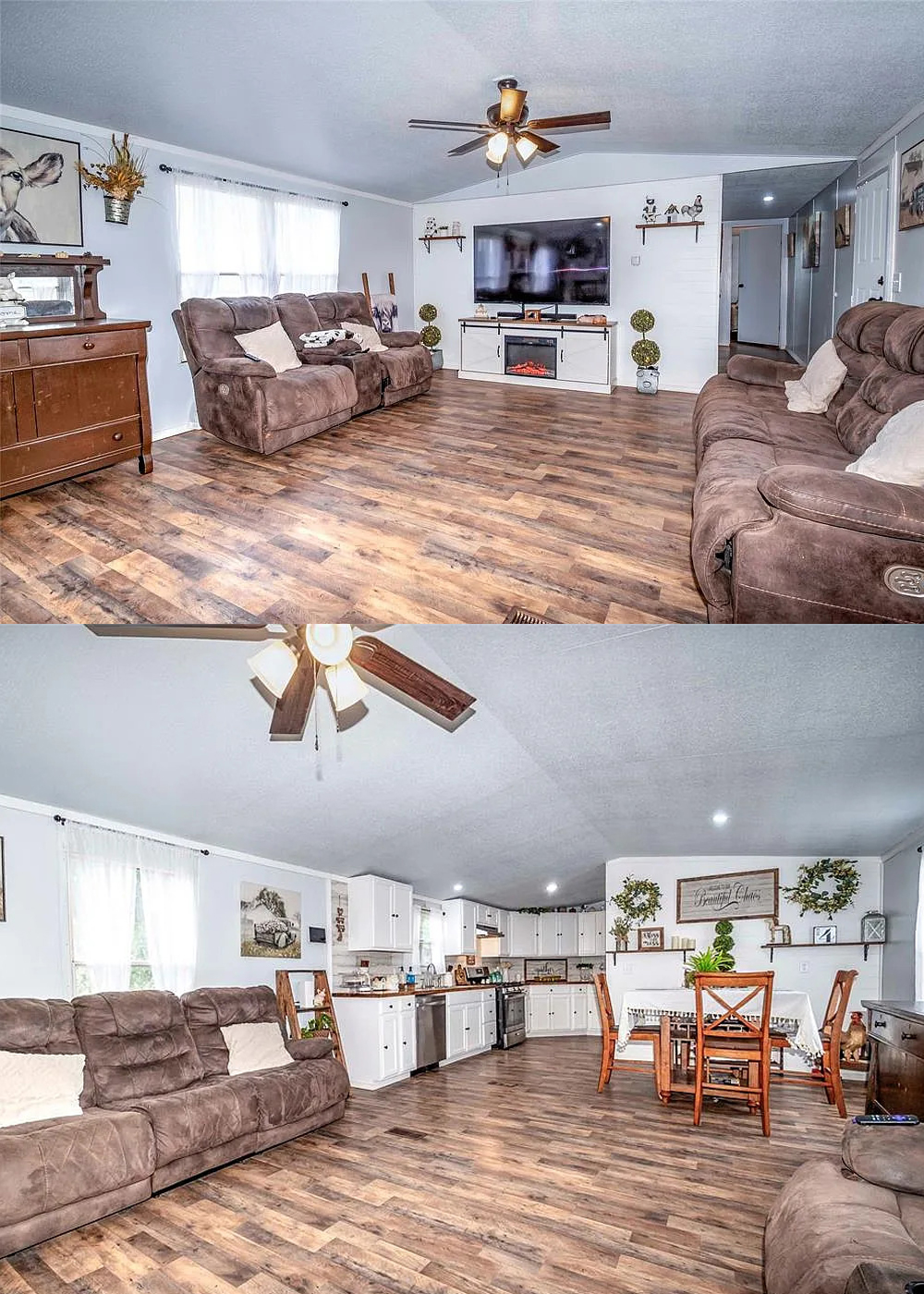 Walk inside and you see everything at once. The living room, dining room, and kitchen are all together. This open space makes the home feel much bigger.