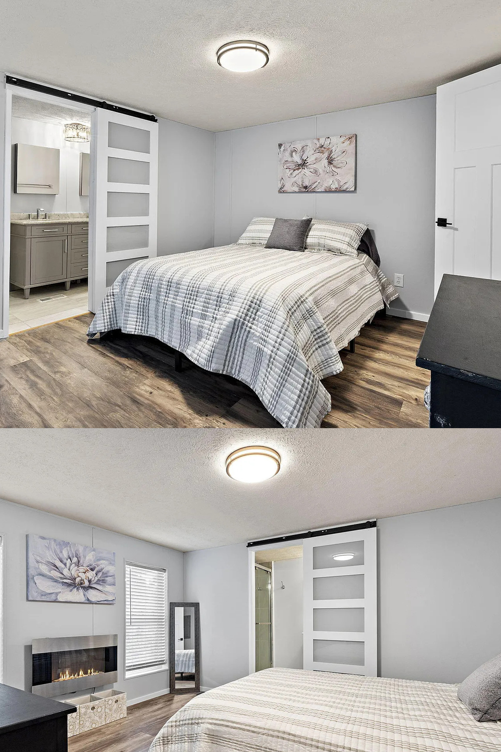 The bedroom continues the home’s calm, neutral look. The gray walls, soft plaid bedding, and simple decor create a peaceful retreat. A modern sliding barn door leads to the private bathroom, adding charm and saving space at the same time.