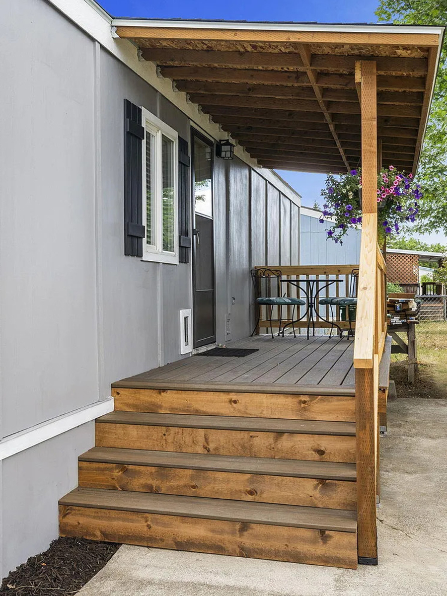 The natural wood railing and steps add warmth and character. The covered roof makes it perfect for enjoying morning coffee or a peaceful evening outdoors. Hanging flower baskets add just the right touch of color and charm.