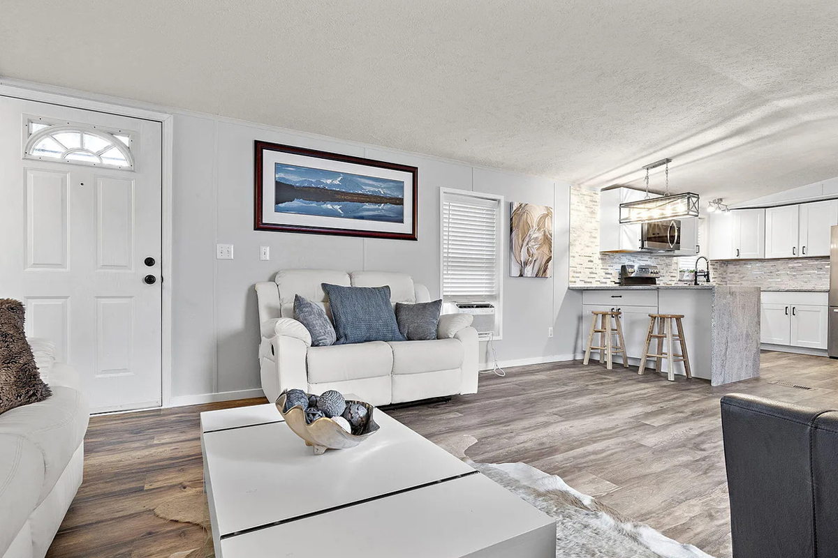 Step inside, and you’re greeted with open space and soft light. The living area, kitchen, and dining nook all flow together, creating one large, airy space that feels surprisingly spacious for a single wide.