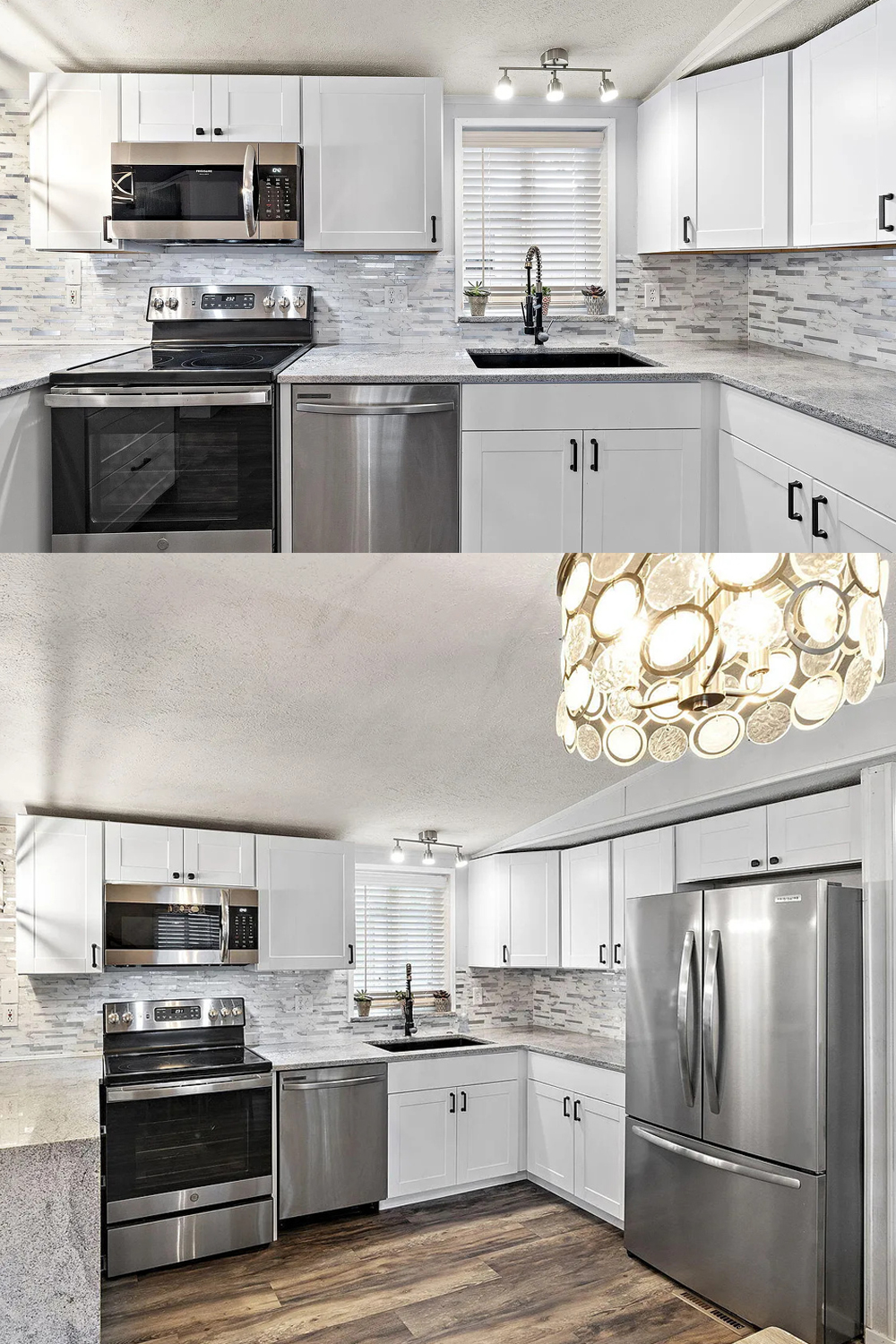 The kitchen steals the show. The cabinets are bright white with black hardware, creating that crisp, timeless contrast. The counters are a soft gray stone-look laminate, and the backsplash adds sparkle with shades of gray, white, and silver tile.