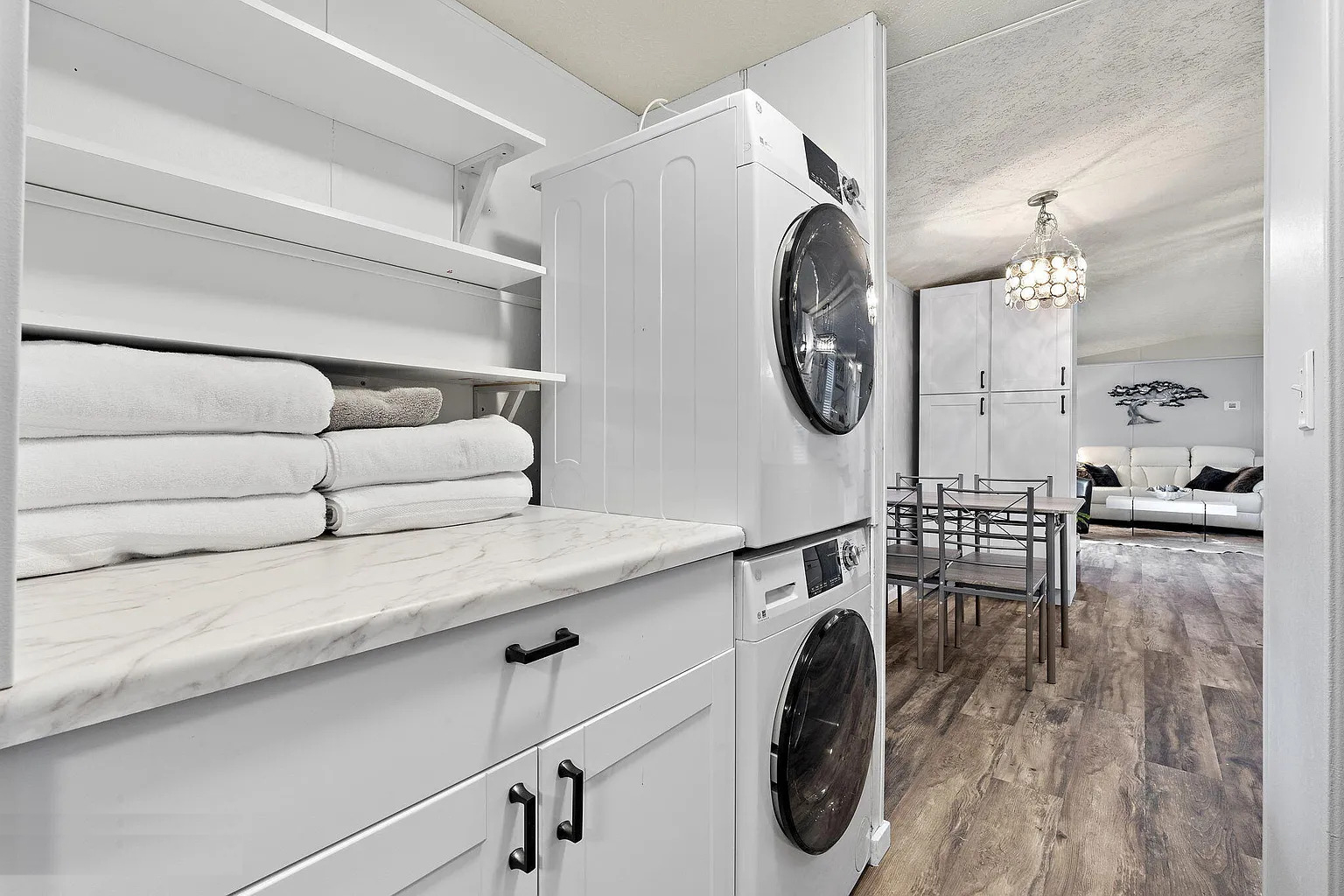 Laundry day doesn’t have to be dull. This small laundry space is proof! The stacked washer and dryer fit neatly into a built-in nook with marble-look counters and white cabinetry. There’s open shelving above for towels and storage, and black hardware ties it back to the kitchen design.
